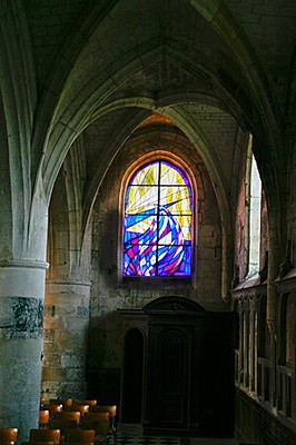Les cartons de ces vitraux ainsi que le travail de peinture sur verre (émaux et grisailles) ont été réalisés par Fleur Nabert, l’exécution ainsi que l’installation ont été confiés à l’atelier de Max Mezziane (Noyon) avec notamment le concours d’Emilie Marcadier.