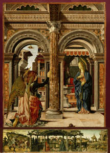 Or l’Annonciation est la fête de l’Incarnation où l’œuvre de Dieu, le Verbe, en Marie prend chair. Et donc cette amputation du tableau provoque une amputation de lecture, de compréhension, de théologie pourtant brillamment offerte par Francesco del Cossa dans cette œuvre où aucun détail n’est laissé au hasard. Je n’en soulèverai que quelques-uns, très peu finalement, mais suffisamment pour qu’un nouvel éclairage fasse jour.