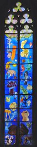 Ainsi le répertoire biologique apparaît dans le vitrail de la Création où dans une sorte de liquide bleu flotte des éléments embryonnaires qui évoquent la vie à ses débuts évoquée dans la Genèse. Toutes ces formes inspirées des bocaux anatomiques peints par l’artiste au Museum d’Histoire naturelle de Paris.