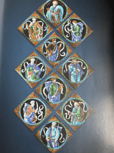 Parmi ces derniers objets, notre attention s’est portée sur l’organisation d’un décor plus « religieux », constitué d’un groupe de dix plaques hautes en couleurs datées de 1535-1540, représentant des apôtres en bustes qui devaient visiblement orner un devant d’autel, ou plus précisément un antependium : mot latin signifiant : » qui pend devant ».