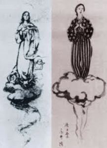 Au dessus de ce nuage, la jeune femme aux mains jointes dans un abandon confiant, au visage  priant mais en même temps serein, fait écho à la Vierge de « l’Immaculée conception » de  Murillo. Takashi Nagai, grand artiste autant que professeur de radiologie reconnu par la faculté  de médecine de Nagasaki, a certainement puisé dans la rencontre avec cette image pour créer  son œuvre.
