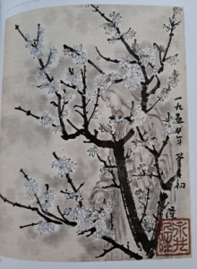 « Branche de chimonanthe figuré devant une statue de la Vierge », Takashi Nagai. Gouache originale, vers 1950. Nagasaki, Takashi Nagai Museum