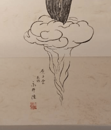 Il ne s’agit pas ici seulement de volutes moutonnantes « en escargot », comme on en voit dans  les peintures japonaises pour rytmer l’espace, mais d’un champignon ascensionnel qui  rappelle tragiquement le nuage atomique du 9 août 1945.