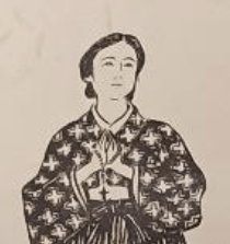 La grâce de la figure, le choix du modèle, son vêtement, le tracé au pinceau et le traitement  en lavis avec les Kanji (caractères japonais) qui légendent l’œuvre signent incontestablement  l’origine nippone de l’artiste. Cependant, la délicate Midori au port de reine, en tenue de combat (elle porte le pantalon rayé des samouraï) a une attitude étrangère à la culture asiatique, avec ses mains jointes et son regard extasié d’orante, levé vers un ciel que l’on devine  habité d’une présence divine :