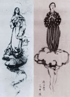 Au dessus de ce nuage, la jeune femme aux mains jointes dans un abandon confiant, au visage  priant mais en même temps serein, fait écho à la Vierge de « l’Immaculée conception » de  Murillo. Takashi Nagai, grand artiste autant que professeur de radiologie reconnu par la faculté  de médecine de Nagasaki, a certainement puisé dans la rencontre avec cette image pour créer  son œuvre.