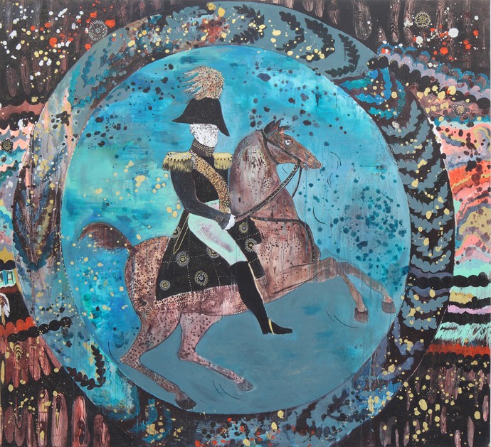 Hélène Delprat, Ils descendirent dans une auberge du quartier Saint-Gervais, où ils eurent à leur souper des assiettes peintes qui représentaient l’histoire de… , 2015, acrylique et pigments sur toile, 240 x 262 cm. © ADAGP, Paris 2017. Courtesy Galerie Christophe Gaillard