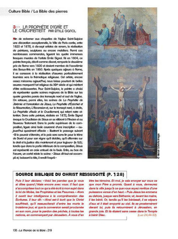 On retrouve, parmi elles, les scènes de « La Prophétie de Jérémie et l’arrestation de Jésus », « La Prophétie d’Ézéchiel et la résurrection », « L’Ascension » et, sur le transept nord, à droite, « La Prophétie d’Isaïe et le Crucifiement », qui retient notre attention. Dans cette peinture, réalisée en 1872, Emile Signol évoque la scène de la crucifixion de Jésus en se référant à l’Ancien et au Nouveau Testament. Dans la partie supérieure de la composition, figure ainsi Isaïe couronné d’une inscription – aujourd’hui quasiment effacée – évoquant les passages suivants « Et le pouvoir s’étendra, et la paix sera sans fin pour le trône de David et pour son règne qu’il établira, qu’il affermira sur le droit et la justice dès maintenant et pour toujours » (Is 9.6) tandis que dans la partie inférieure de la composition, est représenté le Christ en croix entouré de la foule. Enfin, au bas de l’œuvre, un cartel relate la scène : « Jésus dit tout est accompli et, baissant la tête, il rendit l’esprit ».