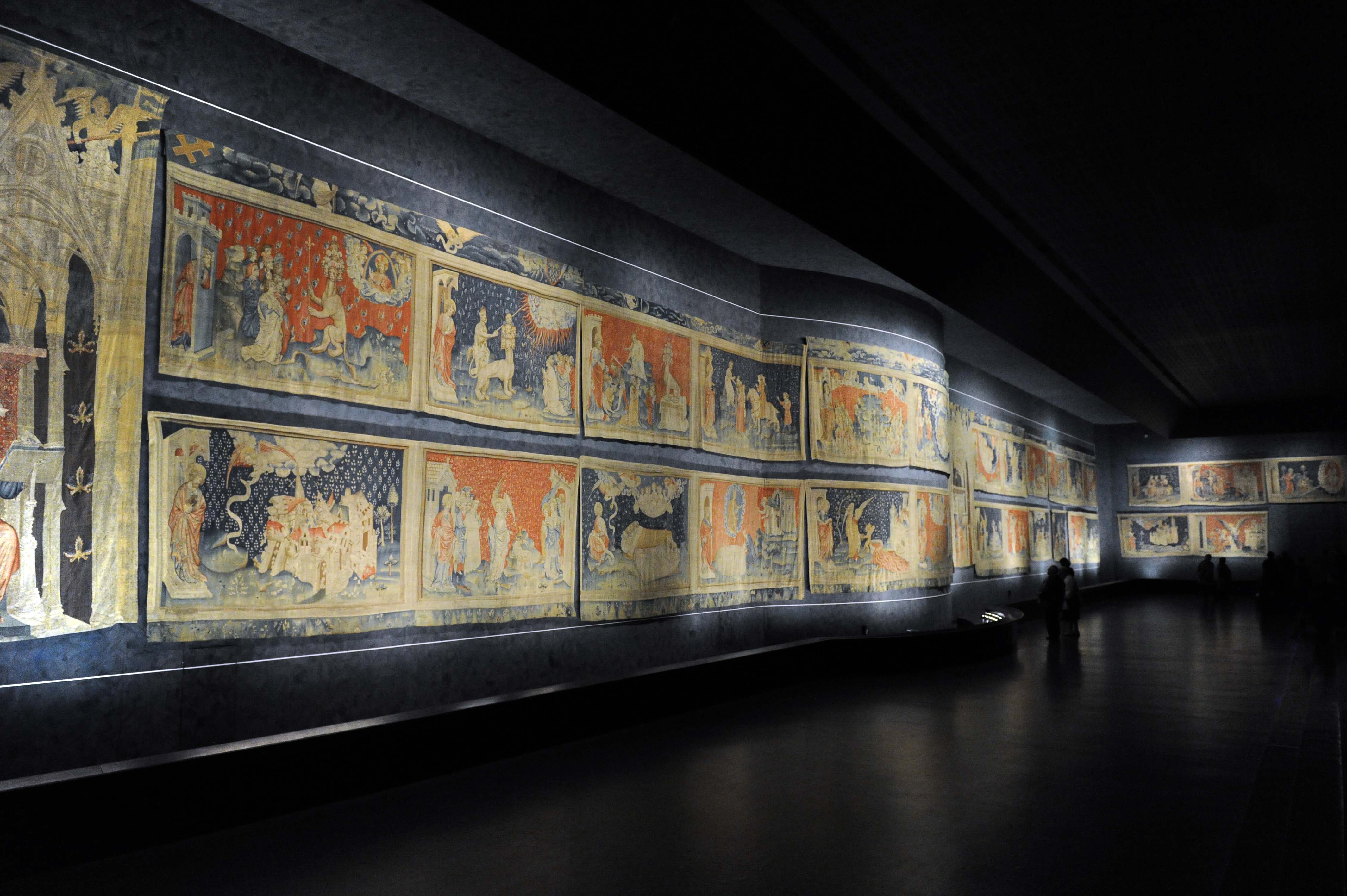 On y découvre le commanditaire et « l’équipe » qui œuvre à la création de la tenture : Louis Ier, duc d’Anjou, frère du roi Charles V et grand amateur d’œuvre d’art, commande vers 1375 cette gigantesque tapisserie (la plus grande tapisserie médiévale conservée dans le monde) illustrant le dernier livre de la Bible, l’Apocalypse de saint Jean. Cet objet d’un luxe ostentatoire devient le fleuron du trésor de la cathédrale d’Angers et magnifie l’édifice lors des plus importantes fêtes religieuses. A la fin du XVIIIe siècle, elle est démembrée et manque de disparaître avant d’être sauvée au milieu du XIXe siècle par le chanoine Joubert. Sa redécouverte entraîne sa présentation dans les plus grandes expositions et son retour au château d’Angers aboutit, en 1954, à la création d’un espace pour l’exposer en permanence, la galerie dans laquelle elle est toujours exposée.