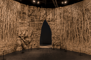Avec Grottesco, d’Eva Jospin, sans commande ni thème imposé, sans intervention de l’Etat ou d’un commanditaire, la liberté de l’artiste et son inventivité plastique conduisent à une réussite autrement incontestable. On sait que l’artiste a dès ses débuts choisi ce matériau délaissé, fragile, irregardable sans doute, qu’est le carton pour y sculpter des arbres, des forêts, des rêves d’ombres et de lumière dans lesquels elle nous invite à pénétrer (fig.3). Dans la vaste salle du Grand Palais, Eva Jospin nous invite dans ce monde d’architectures et de visions, et nous nous perdons dans les détails de stalactites et de stalagmites, où nos yeux comme notre esprit jouent avec bonheur à qui perd gagne. Ou plutôt qui se perd se trouve, qui se laisse tromper par l’ambition de ces palais gigantesques et minuscules se sent grisé, envoûté, emporté dans des espaces utopiques, des monuments au passé comme à l’avenir (fig.4). Telle est l’expérience miraculeuse de cette plongée dans un monde qui est aussi bien celui de la forêt des contes de notre enfance que le Panthéon de Rome, les façades de Borobudur, les grottes de la Renaissance, de la préhistoire, de nos rêves aussi. Fascination de la magie des formes qui nous entourent et nous transportent. Nous nous promenons en découvrant sans cesse de nouvelles associations d’ombres et de lumières, des germinations de détail minuscules où le petit renvoie, sans transition, à l’ensemble qui nous environne. L’esprit, toujours facétieux, souffle, décidément, où il veut !